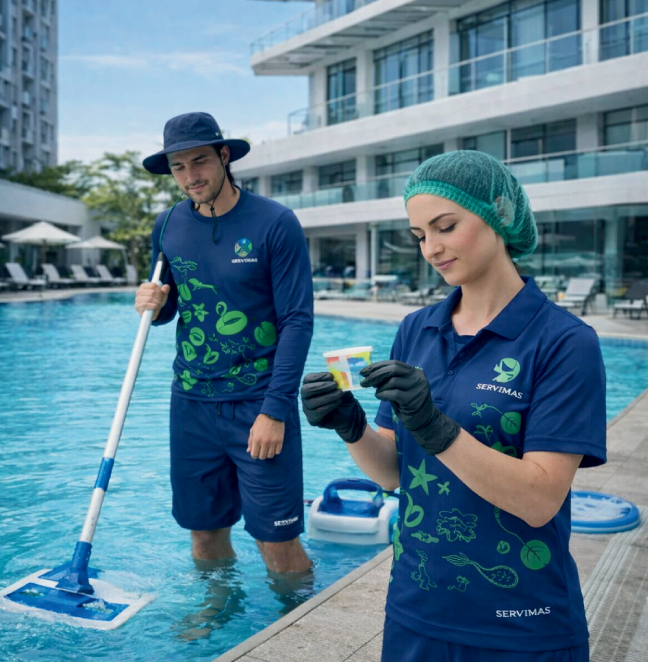 Personal capacitado para labores de limpieza, mantenimiento y cuidado de piscinas, asegurando su buen estado y correcto funcionamiento.