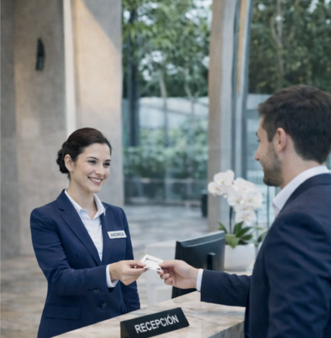 Atención amable, rápida y eficiente a visitantes, clientes y usuarios, fortaleciendo la experiencia de ingreso y la imagen de su empresa, hotel o residencia.